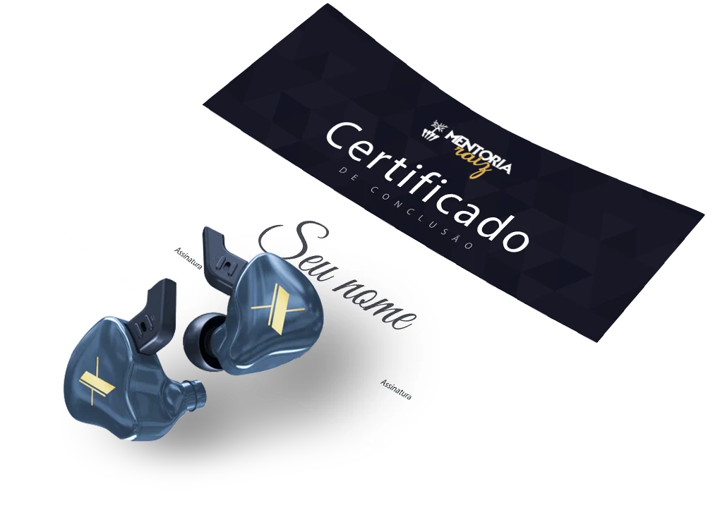 Na Mentoria Raiz você sabe sempre qual seu próximo nível sem se perder. Todos alunos que são aprovados na prova final após os 3 meses, recebem um Certificado Digital + 1 Fone Profissional KZ!